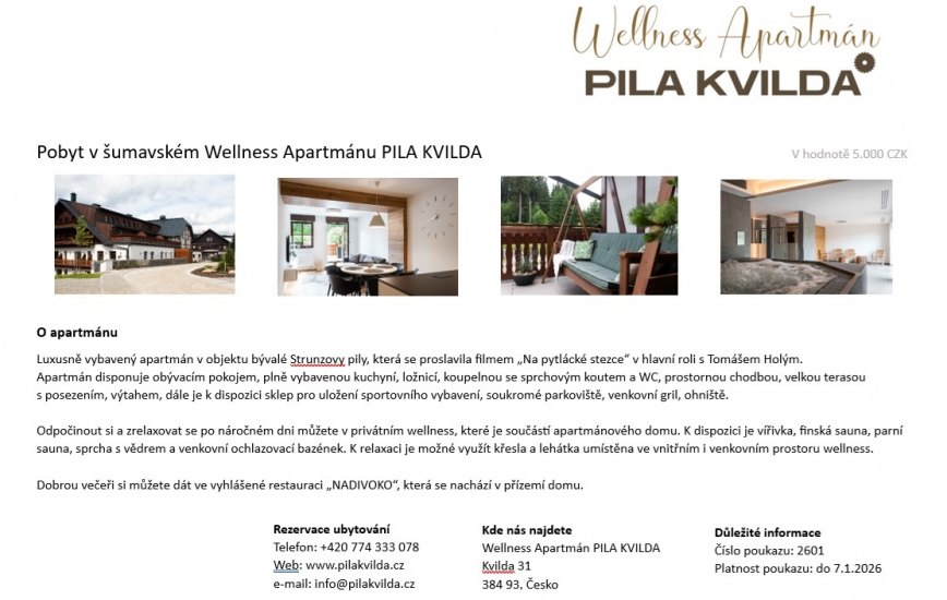Udělejte radost svým blízkým koupí dárkového poukazu na pobyt ve Wellness Apartmánu PILA KVILDA.