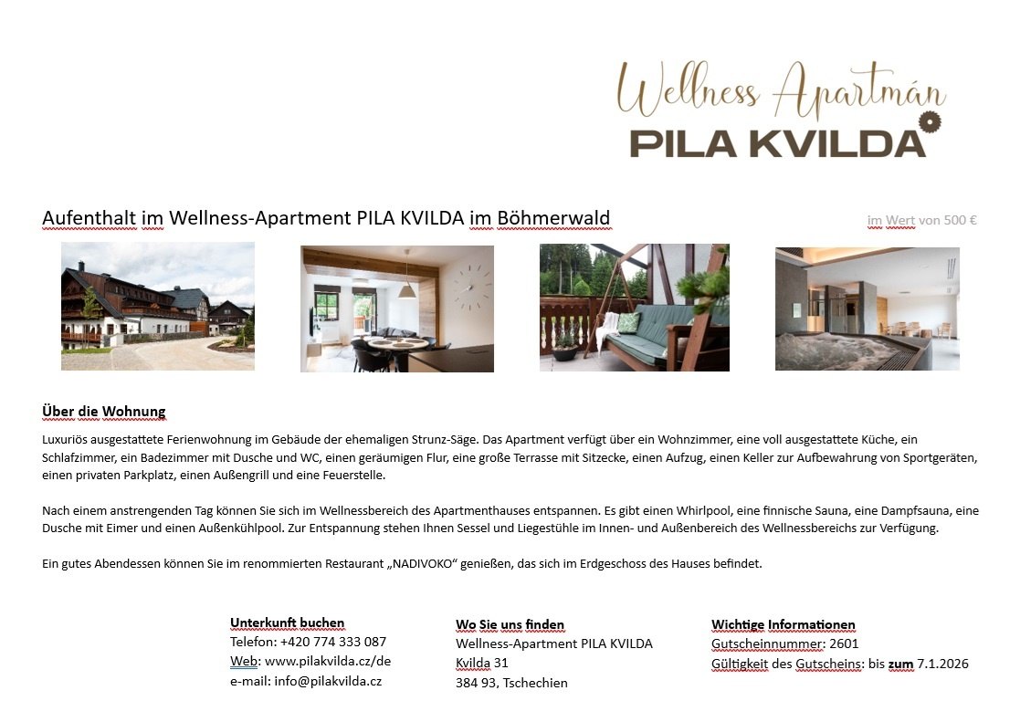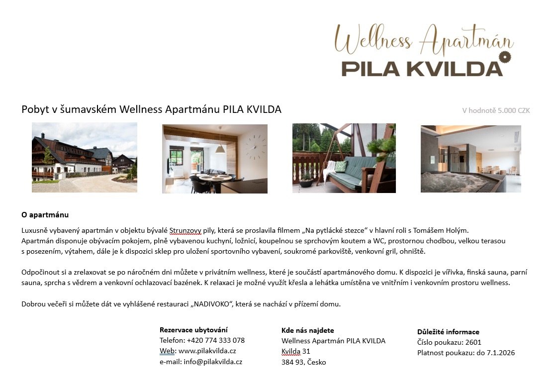 The gift voucher can be ordered using the form in the footer below, or by email info@pilakvilda.cz.